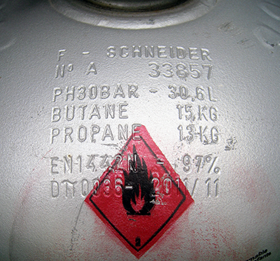 Une bouteille de propane en acier dont la capacité et le poids de la charge de gaz sont gravés sur le métal. Documentation Picbleu
