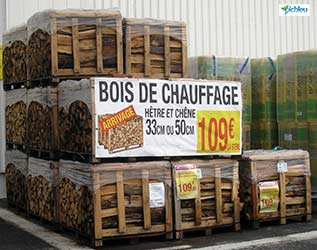 Linéaire de vente dans une grande surface nationale de bricolage (64) de bois de chauffage de hêtre et de chêne en 33 cm ou 50 cm. Photo Picbleu